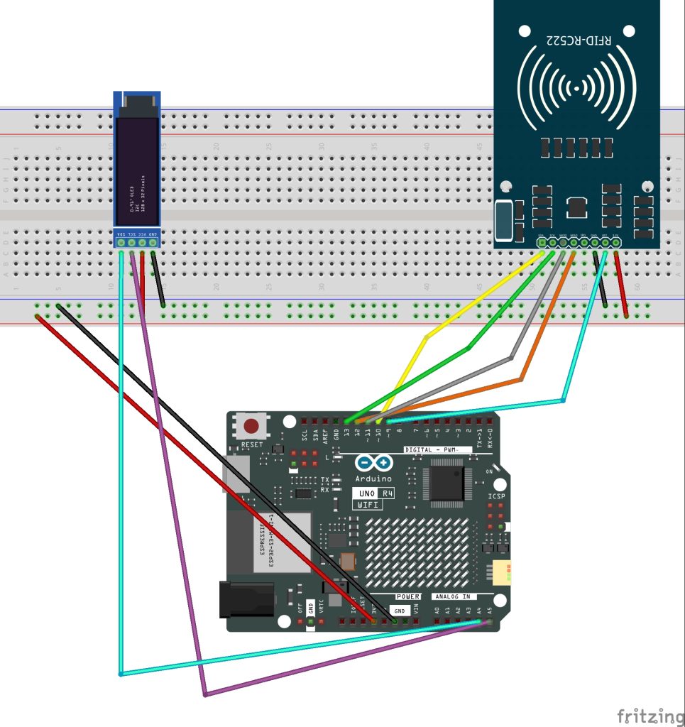 Bağlantılarımızı yaparken dikkat etmemiz gereken konulardan biri RFID kart okuyucunun sadece 3.3V ile çalışmasıdır. Yüksek voltaj modüle zarar verebilir. OLED ekranı 3.3V veya 5V ile çalıştırabilirsiniz. Bu örnekte 3.3V tercih edilmiştir. Kod bölümünde RFID okuyucuya gösterilen bir anahtarlık veya kartın doğrulanıp doğrulanmamasına göre OLED ekran üzerinde bir mesaj gösterilmektedir.