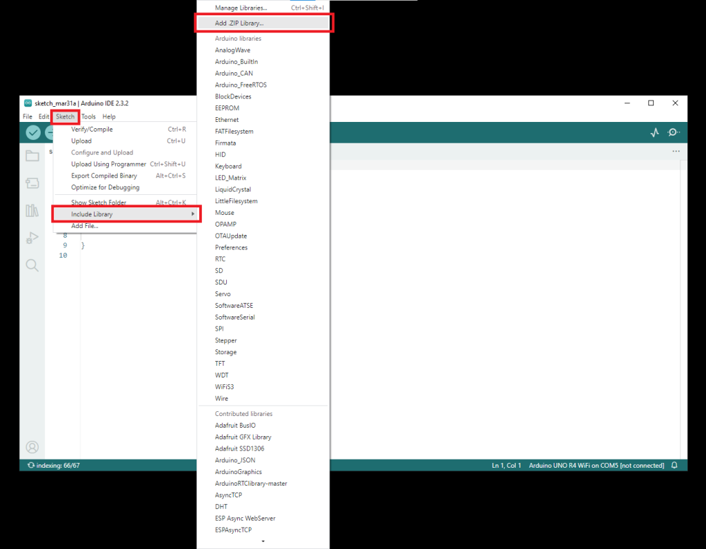 Öncelikle Arduino™ IDE’mizi açıyoruz. Sketch > Include Library > Add .ZIP library seçeğine tıklıyoruz.