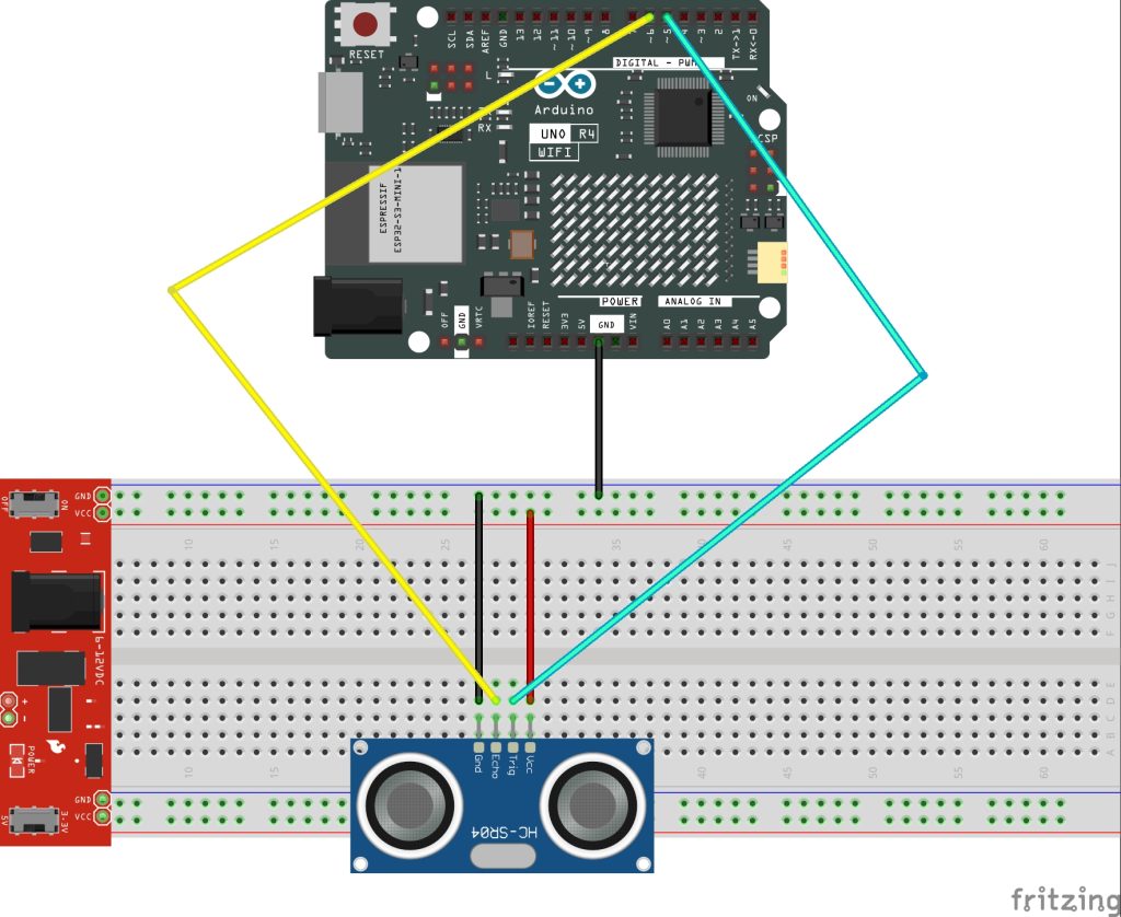 Projede, kullanılan Arduino™ UNO R4 WIFI kartına zarar vermemek için Breadboard Power Supply ile sensöre güç verilmesi tercih edilmiştir. Sensörü kart ile haberleştirebilmek için kartın GND’si ile Breadboard Power Supply’in GND’si birbirine bağlanmalıdır. Bağlantıyı aşağıda bulabilirsiniz.
