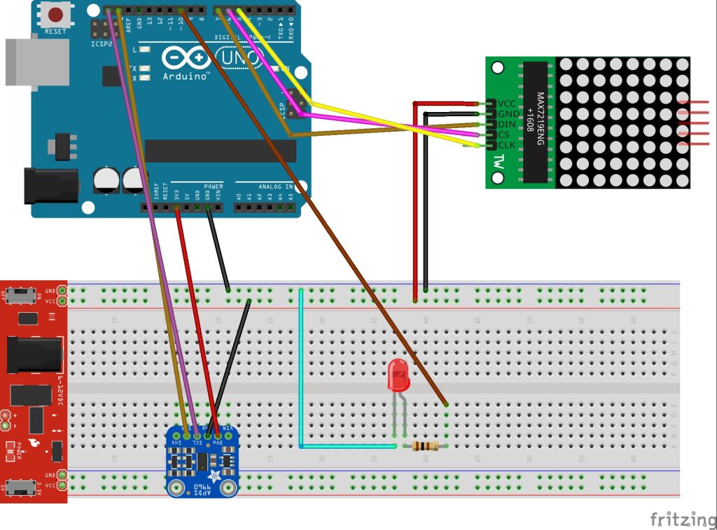 Bağlantılarımızı yaparken dikkat etmemiz gereken konulardan biri GY-APDS 9960 hareket sensörünün sadece 3.3V ile çalışmasıdır. 8×8 Dot Matrix’in yüksek güç tüketiminden dolayı harici bir kaynaktan beslemek daha iyi olacaktır. LED’I bağlarken direnç kullanımını da öneriyoruz. Kod bölümünde hareket sensöründen yön bilgisi alınır. Yön bilgisine göre zaman kesmesi kullanılarak dot matrix üzerinde yön gösterilirken led yanıp sönmektedir.